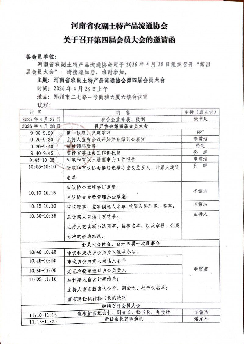 河南省农副土特产品流通协会关于召开第四届会员大会的通知