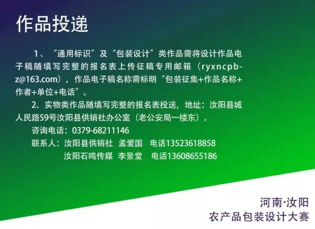凡从事平面、包装设计者为汝阳县农产品创意设计的包装作品,及本县农产品生产、加工、销售单位自行设计的特色包装物,均为本次大赛征集对象。